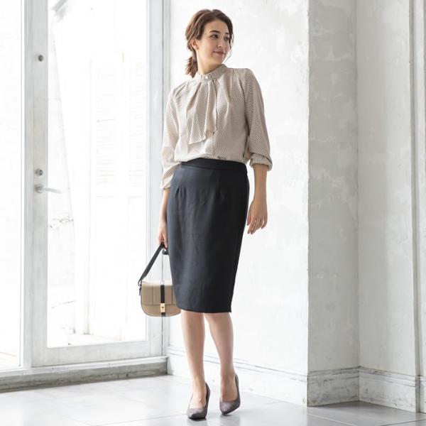 落ち着いた色合いと胸元のスカーフタイが大人っぽい印象のブラウス。