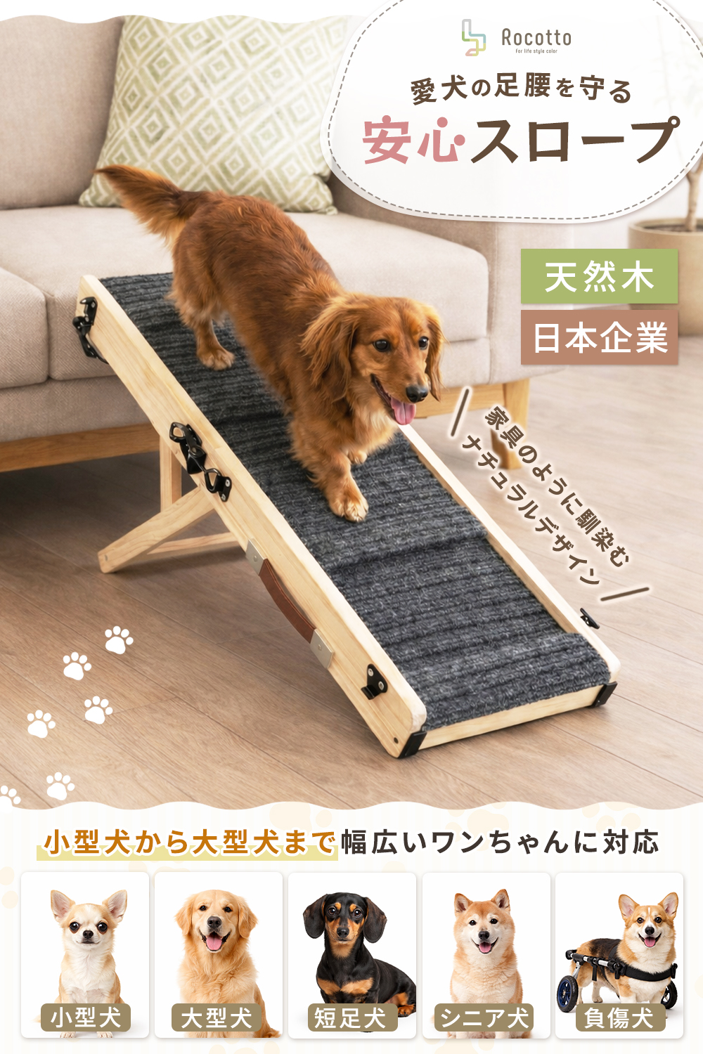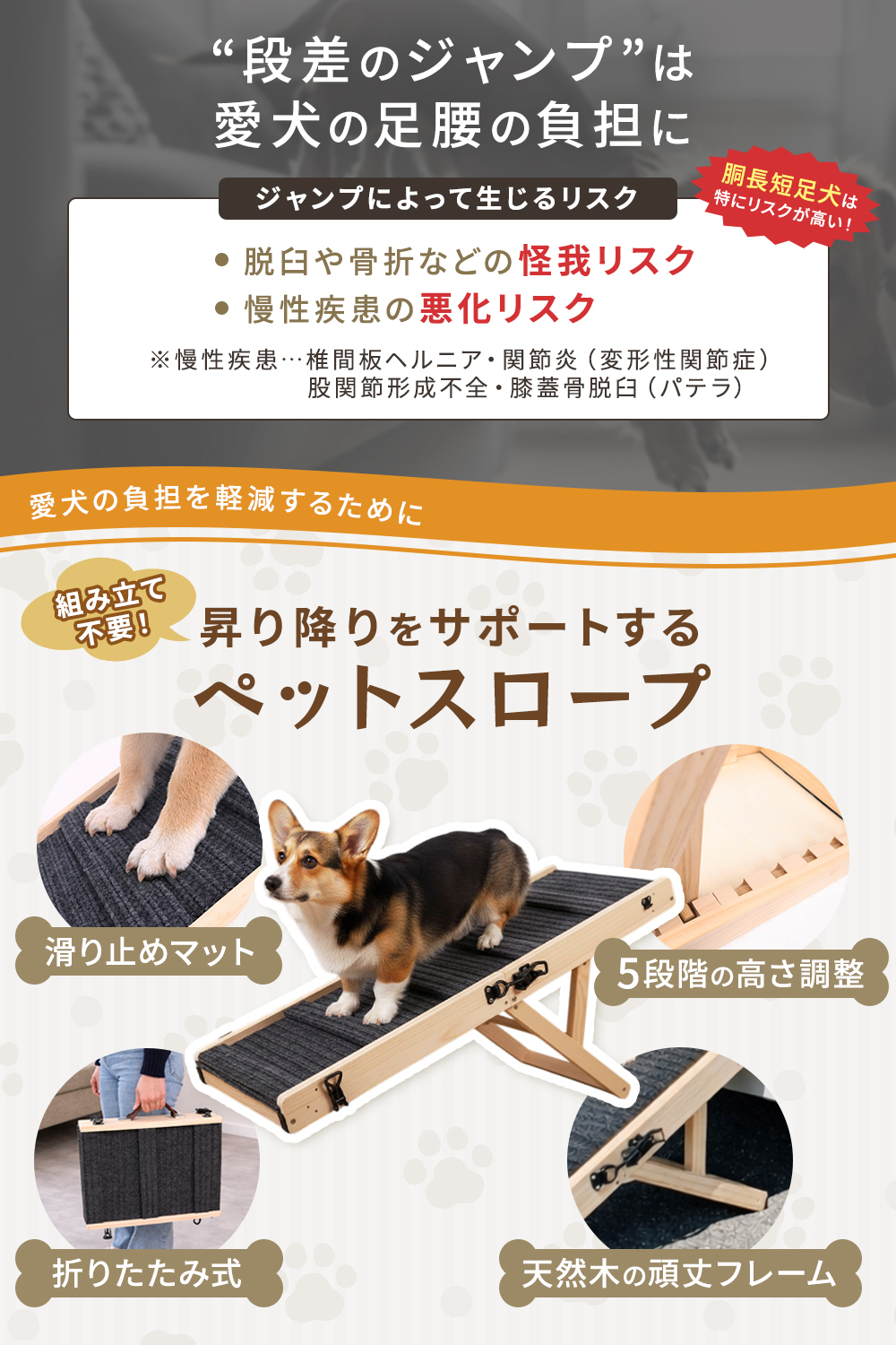 このペットスロープは段差の上り降りをサポートし、愛犬の足腰への負担をやさしく軽減します。