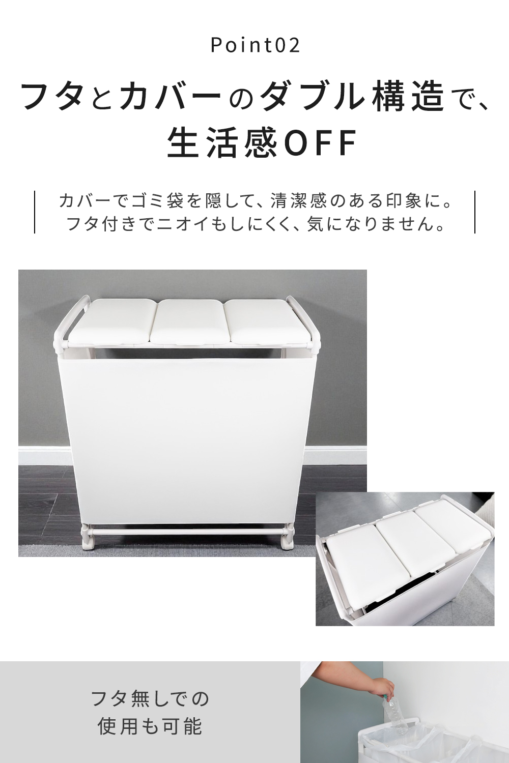 フタ+カバーの二重構造で中身を隠し、ゴミ箱らしさを感じさせないデザイン。