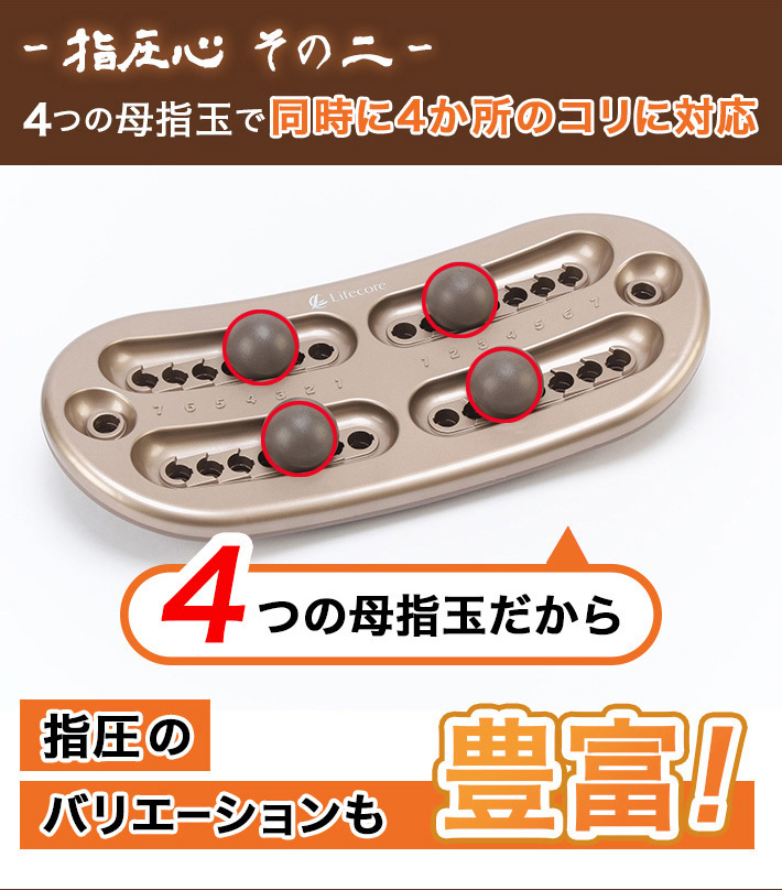 親指の構造を球体で再現し、どこから当てても一点に圧がかかり、湾曲した身体にフィットして垂直圧の再現が可能になります。垂直圧だからもみ返しが起きにくいのも嬉しいポイントです。4つの母指玉で同時に4か所のコリに対応。