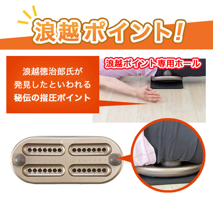 浪越指圧3代目「浪越孝」プロデュースの家庭用指圧代用器「浪越式 指圧心」です。浪越指圧のひとりひとりの身体に母ごころを持って接する「思いやりのこころ」を商品化。1日5分乗るだけ、これ1台で全身のお手入れが可能です。