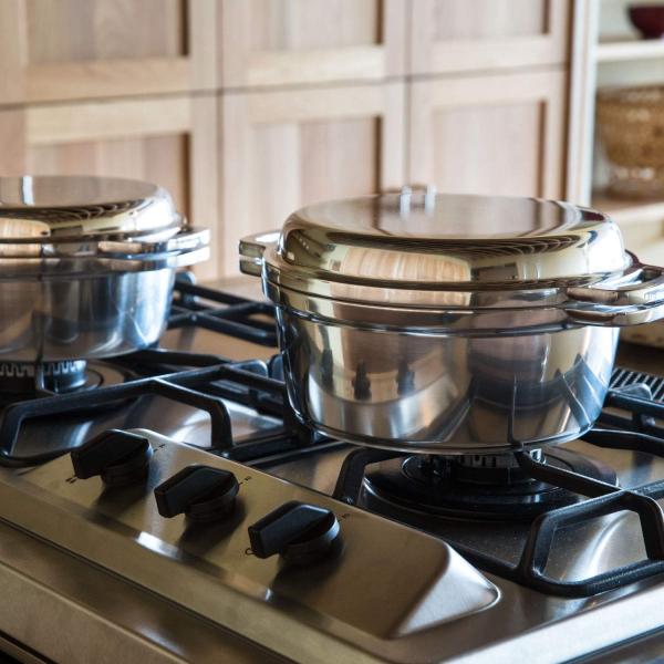 無水鍋(R)は本体・フタとも、熱伝導性がよく耐久性に優れた厚手の高級アルミ鋳物製です。