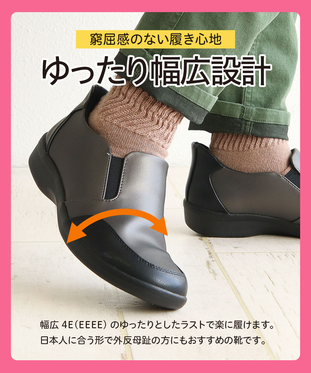 ■ゆったり4Eのオブリークラストを使用した、「トパーズ」のコンフォートシューズ。