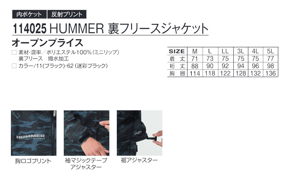 HUMMER 作業服 防寒着 メンズ 作業着 ジャンパー 冬 防寒 ジャケット メンズ 秋冬 カジュアル フリース 大きいサイズ 黒 迷彩 ハマー アタックベース 114025