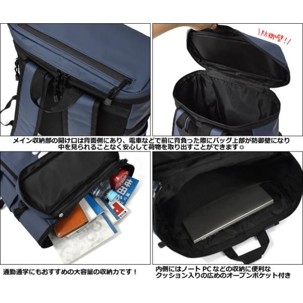 ■ メイン収納部の開け口が背面側にあり、電車などで前に背負った際にバッグ上部が防御壁になり中を見られることなく荷物を取り出せる安心設計になっています!