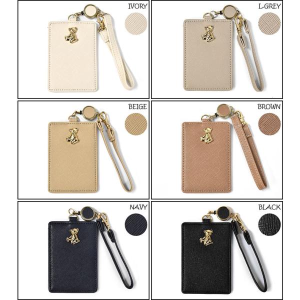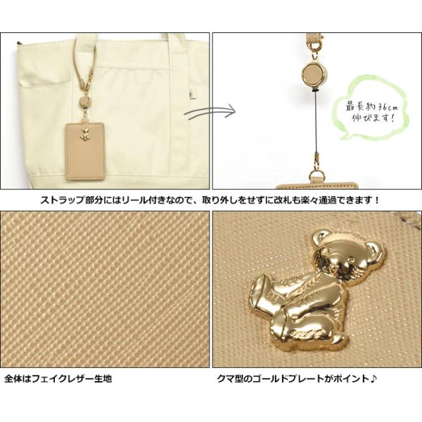 レディース 定期入れ ケース icカード ストラップ ストラップ付き 1枚 リール リール付きパスケース 合成皮革 合皮 革 レザー PU シンプル 可愛い かわいい おしゃれ オシャレ 動物 アニマル グッズ 熊 テディベア モチーフ アイボリー ベージュ ブラウン