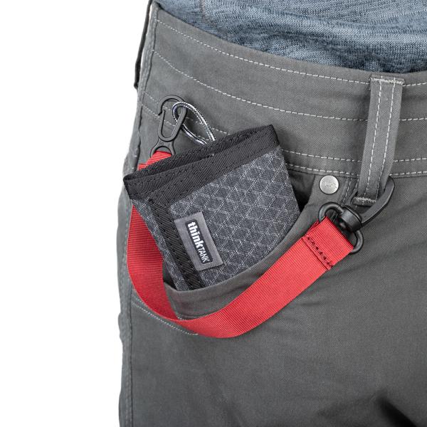 メモリーカードウォレットは背面に ID カードスロットと携帯に便利なベルトループを備え、また、取り外し可能な紛失防止ストラップも付属します。