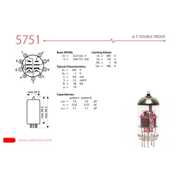 JJ 5751 (12AX7 類似) JJエレクトロニック プリ管・前段増幅用 双3極管・12AX7互換あり・12AX7と比較し3割低μで低雑音・12AX7と交換し音の違いを楽しめます---仕様(類似管):12AX7 ECC83---