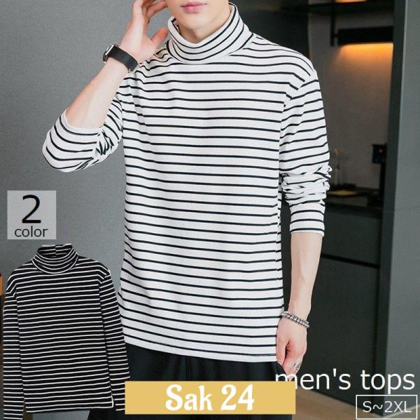 カットソー 長袖 メンズ 男性用 トップス タートルネック ハイネック ボーダー柄 大きいサイズ ゆったり おしゃれ カジュアル シンプル モノトーン ブラック ホ