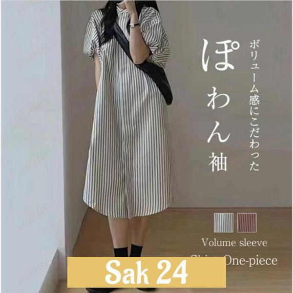 シャツワンピース ロング ワンピース ストライプ きれいめ 春 夏 半袖 大きいサイズ レディース ボリュームスリーブ ぽわん袖 羽織り ロングシャツワンピ