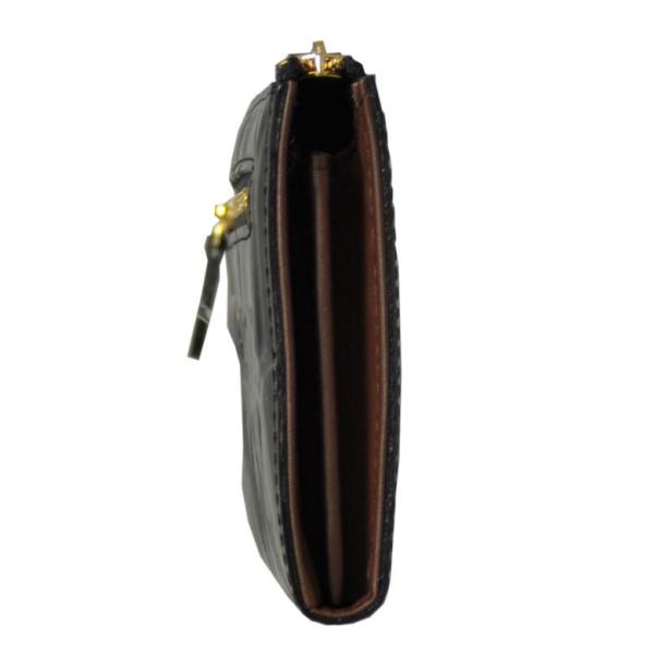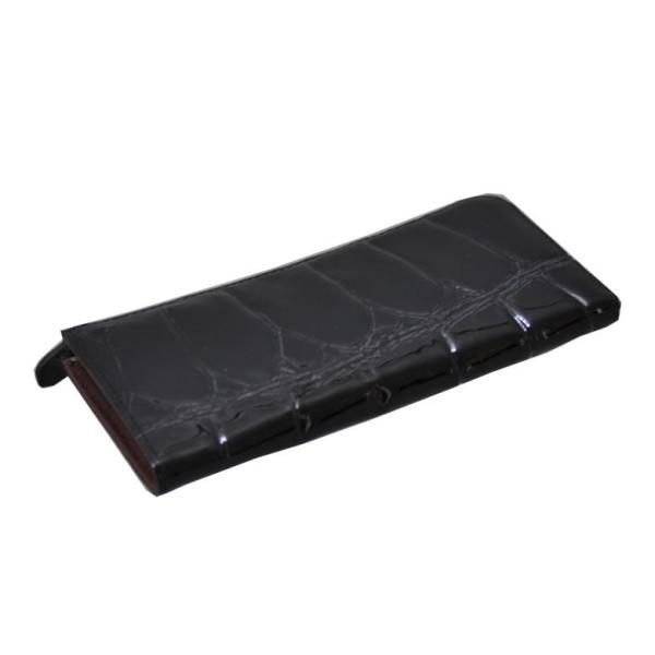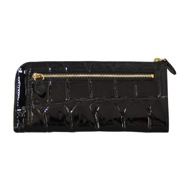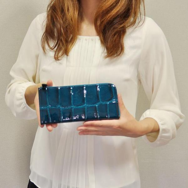 牛革のエナメル素材にワニのテールを型押しした長財布。