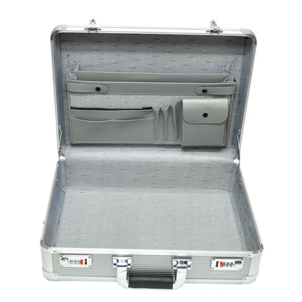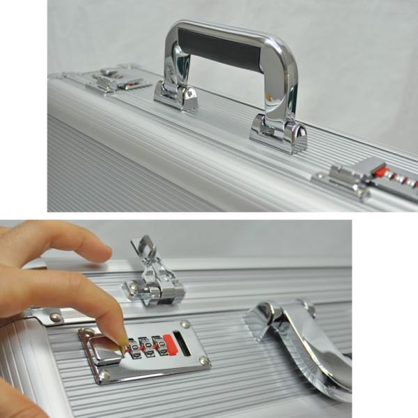 ・重要書類を持ち運ぶために誕生したアタッシュケース。硬質な箱型の鞄は機密と信頼を運ぶ重要なアイテムとして活躍しています。軽く、衝撃に強いアルミ素材はあなたの大切なパソコンや書類を過酷な条件から確実に守ります。・こちらのアタッシュはA3ファイル対応サイズ。・ダイヤルロック機能・・・あなたの機密を守り確実な安心感を生むロック機能・ハンドル・・・重たい書類を持ち歩くことを意識した、しっかりと握りやすいグリップ感・ショルダーベルト用ホック・・・ショルダーベルト用ホックをケースサイドに装備。快適な搬送をサポートします・内装・・・深さもあり厚みのあるファイルやカタログも余裕で収納。ビジネスアイテムを効率よく収納するオーガナイザーポケットも充実。