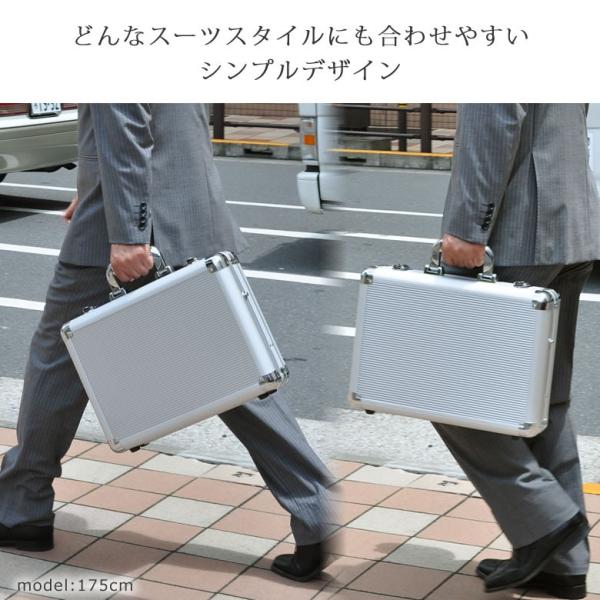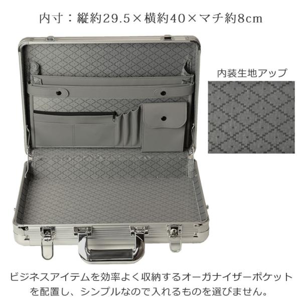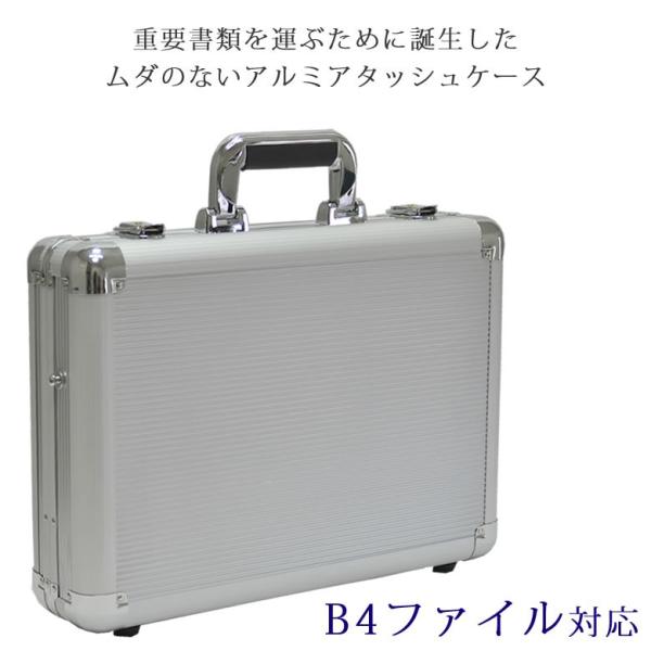 ・重要書類を持ち運ぶために誕生したアタッシュケース。硬質な箱型の鞄は機密と信頼を運ぶ重要なアイテムとして活躍しています。軽く、衝撃に強いアルミ素材はあなたの大切なパソコンや書類を過酷な条件から確実に守ります。・こちらのアタッシュはB4ファイル対応サイズ。・キーロック機能・・・あなたの機密を守り確実な安心感を生むロック機能・ハンドル・・・重たい書類を持ち歩くことを意識した、しっかりと握りやすいグリップ感・ショルダーベルト用ホック・・・ショルダーベルト用ホックをケースサイドに装備。快適な搬送をサポートします・内装・・・深さもあり厚みのあるファイルやカタログも余裕で収納。ビジネスアイテムを効率よく収納するオーガナイザーポケットも充実。