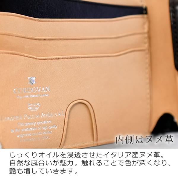 メイン素材はその希少性と高級感、透明感のある美しい発色で『革のダイアモンド』と呼ばれる『コードバン』。その圧倒的な存在感はシンプルなフォルムが引き立てます。使い込む程、さらに艶が増し宝石のように透明感に溢れた美しい光沢をまといます。