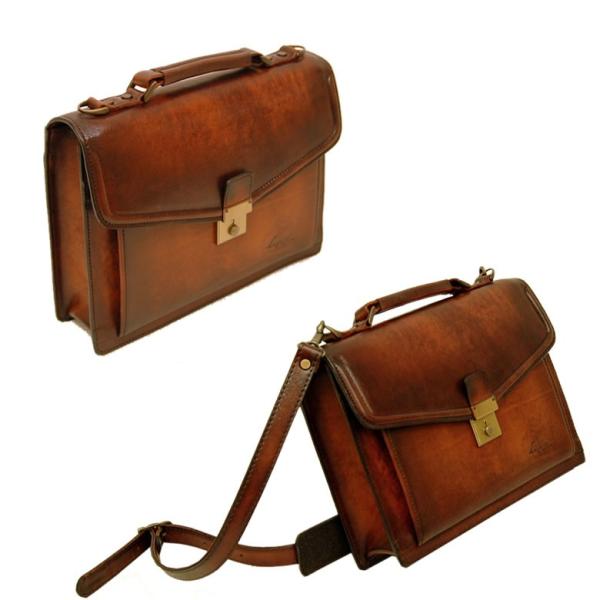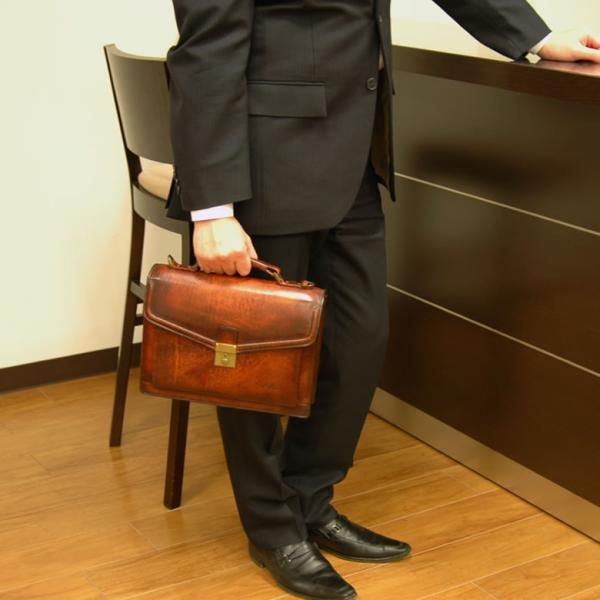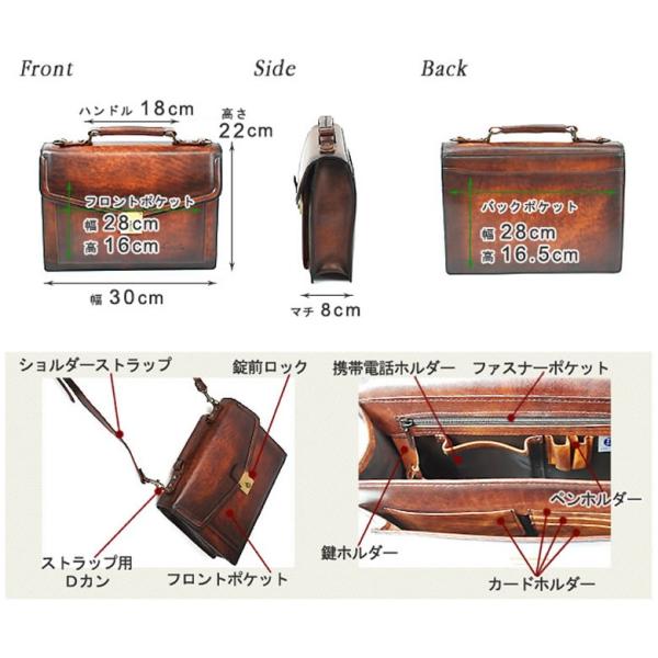 ・末永くお使いいただける牛革ショルダーバッグ。フロントポケットがポイント。贈り物にもおすすめします。特殊染料でシャドーをかけた深みのあるブラウン色が特徴。男性的なステッチワークがワイルドな魅力を引き立てるトータルビジネス・シリーズです。小物もスッキリと収納できます。日本製。