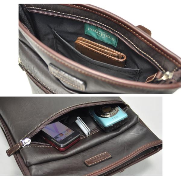 ・軽くて丈夫で機能的。毎日の通勤や出張、プライベートにピッタリのビジネス+カジュアル対応の「POLO FIELD」バッグシリーズ・普段持ち歩く小物が入る「程よい大きさ」・・・使い勝手を追求し、貴重や身の回りのものをスッキリ収納して持ち歩けるます。・本体は合皮素材付属部分は牛革を採用し、高級感と手軽さを両立しています。・簡単に容量がアップするマチ拡張機能が付いたショルダーバッグ。・本体側面部分にファスナーが取り付けられていて、これを開閉する事によって、より多くの荷物を収納っすることができます。・本体フロント部分にファスナー開閉の立体ポケットが付いていて、スマートフォンや携帯電話などがスッキリと収納することが可能。・安心のファスナー開閉のメインルームはシンプルな作りですが、財布や手帳、文庫本などをまとめて入れても余裕の収納力が嬉しい。・収納背面にもオープンポケットが付いて便利に使えます。