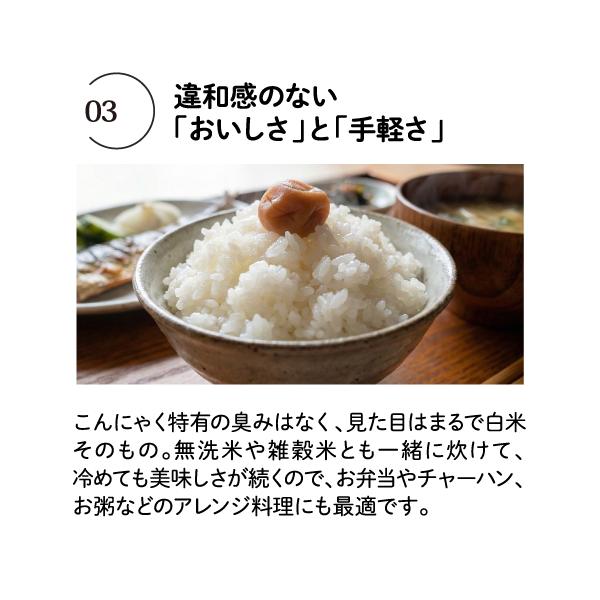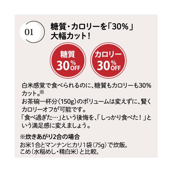 栄養成分表示(炊飯前100gあたり):エネルギー:246kcal、たんぱく質:0.2g、脂質:0.3g、炭水化物:87.8g(糖質58.7g、食物繊維:29.1g)、食塩相当量:0.3g ※食物繊維の一部としてポリデキストロース:12.8g、セルロース:12.4gを使用(エネルギー換算係数0kcal/g)を使用