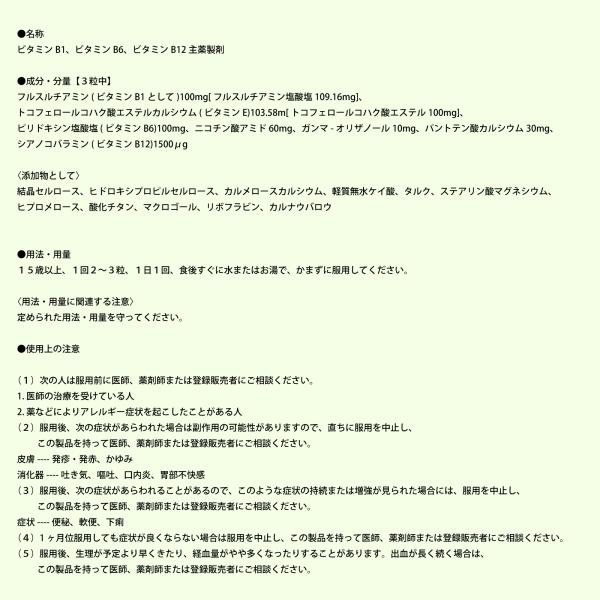 次の症状の緩和:神経痛、筋肉痛、関節痛(肩・腰・肘・膝痛・肩こり・五十肩など)手足のしびれ、眼精疲労(慢性的な目の疲れ及びにそれに伴う目のかすみ・目の奥の痛み)「ただし、これらの症状について、1ヶ月ほど使用しても改善が見られない場合は、医師又は薬剤師に相談すること。」 次の場合のビタミンB1、B6、B12の補給:肉体疲労時、妊娠・授乳期、病中病後の体力低下時 このような症状に効果を認められています。