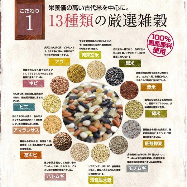 13種類の厳選素材:発芽玄米 黒米 赤米 緑米 胚芽押麦 もち麦 活性生大麦 ハト麦 高キビ アマランサス ヒエ キビ アワ