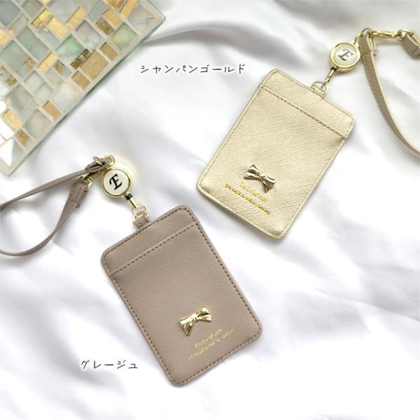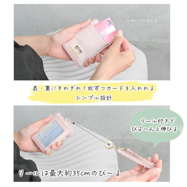 リボンがカワイイイ、ニシャル入り伸びるリール付きパスケース。定期やicカードを入れてバッグに付けておけばバッグから出す手間なく簡単ピタッとタッチできます。定期入れのほかに交通電子マネーやセキュリティカードなどカードタイプのものを入れて使うのもおすすめ。通勤、通学、日常生活に役立つお洒落で可愛い、便利なカードケースです。