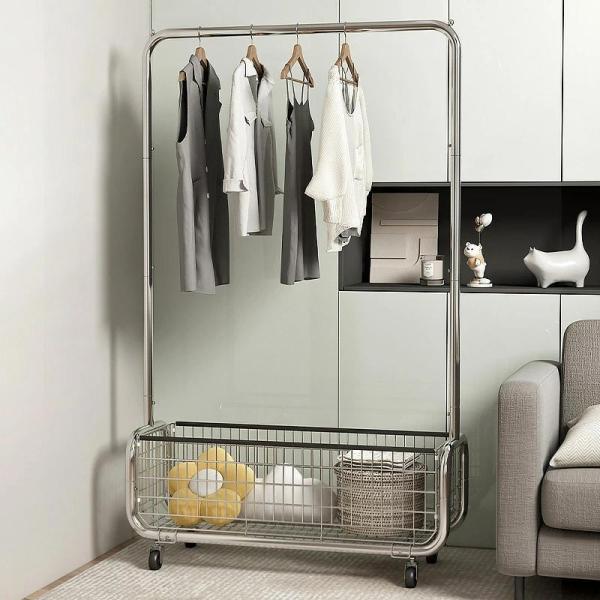 ハンガーラックキャスター付き 衣帽掛け 寝室用 ベッドサイドクローゼット 衣服掛け簡易収納ラック 洋服ラック収納カゴ付き多機能収納 大容量パイプハンガーラ