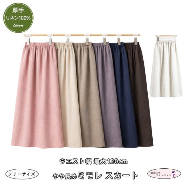 [半額クーポン発行中] リネン100% スカート レディース ミモレ丈 厚手 麻 フレア ウエストゴム ゆったり 体型カバー ナチュラル 無地 ロングスカート