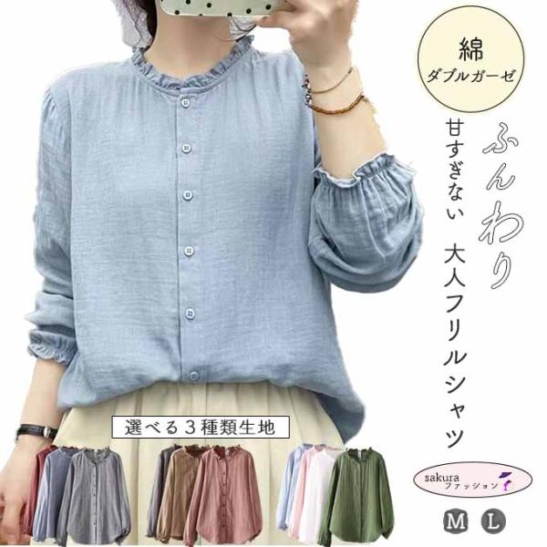 ダブルガーゼ シャツ レディース 春 夏 秋 冬 M L フリル襟 バンドカラー フリル袖 無地 ギンガム 千鳥 立襟 スタンドカラ