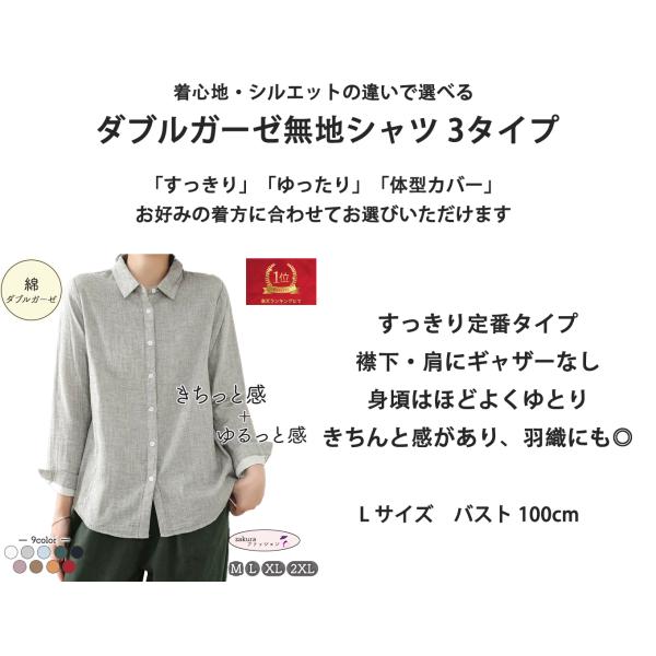 ダブルガーゼ シャツ レディース 春 夏 秋 冬 M L XL バンドカラー スタンドカラー 立襟 襟なし ノーカラー 綿100% 長袖