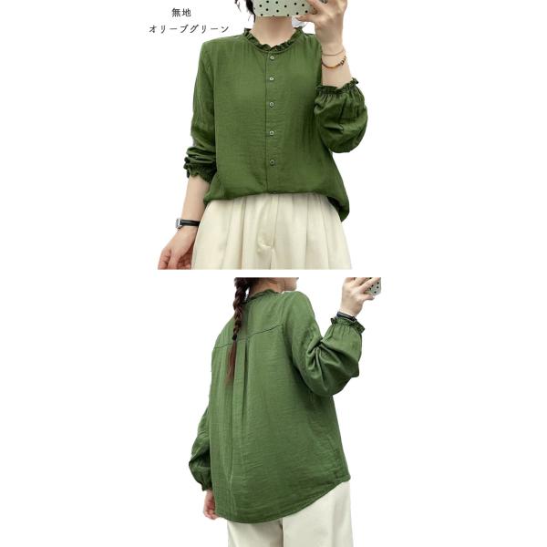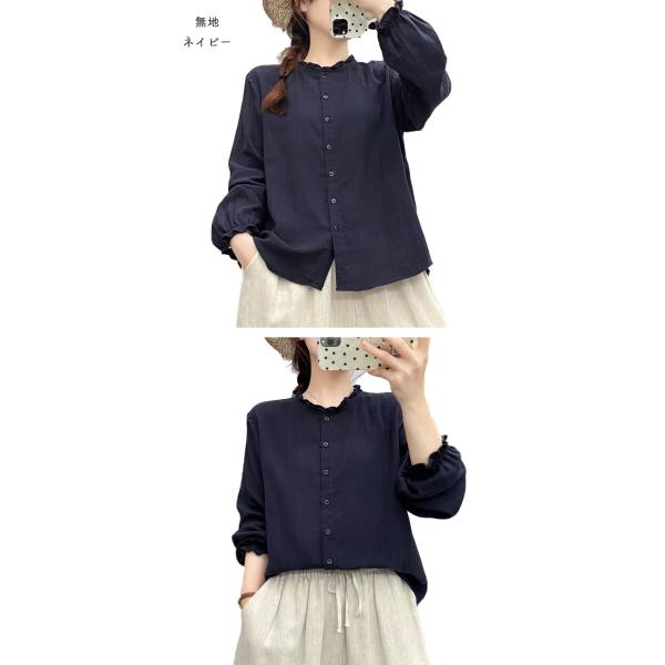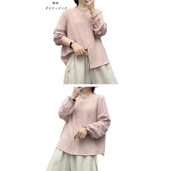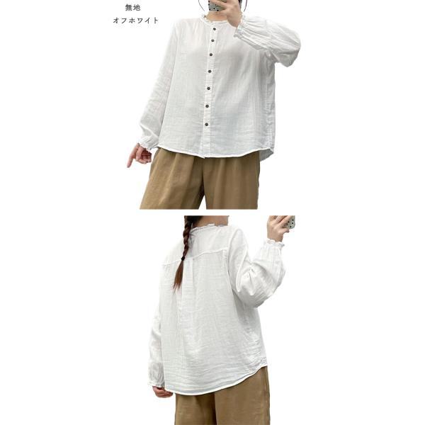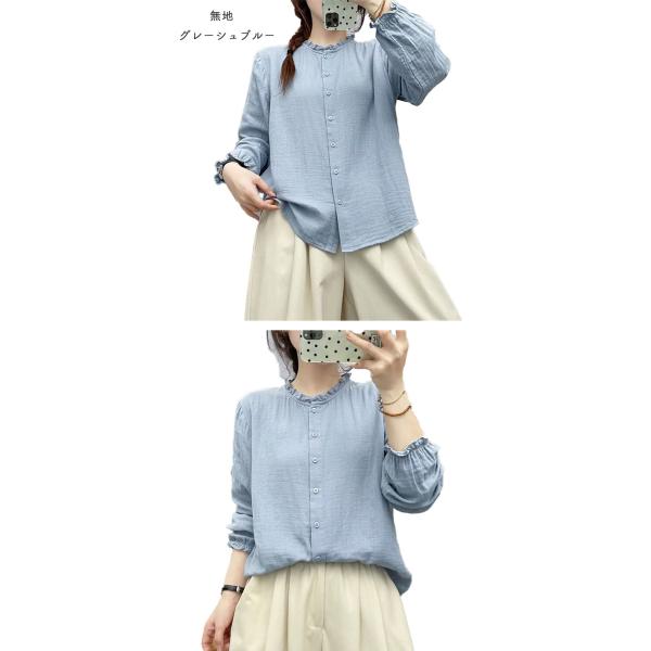 ダブルガーゼ シャツ レディース 春 夏 秋 冬 M L フリル襟 バンドカラー フリル袖 無地 ギンガム 千鳥 立襟 スタンドカラ