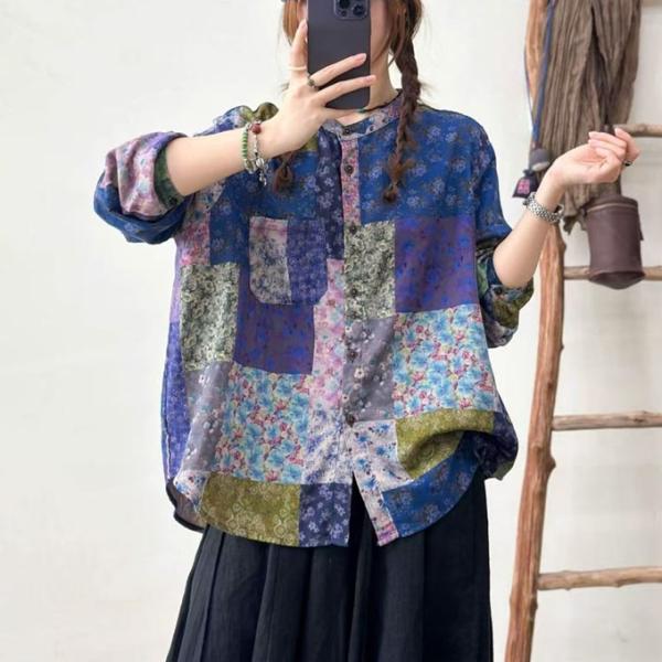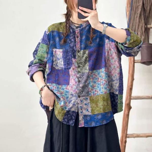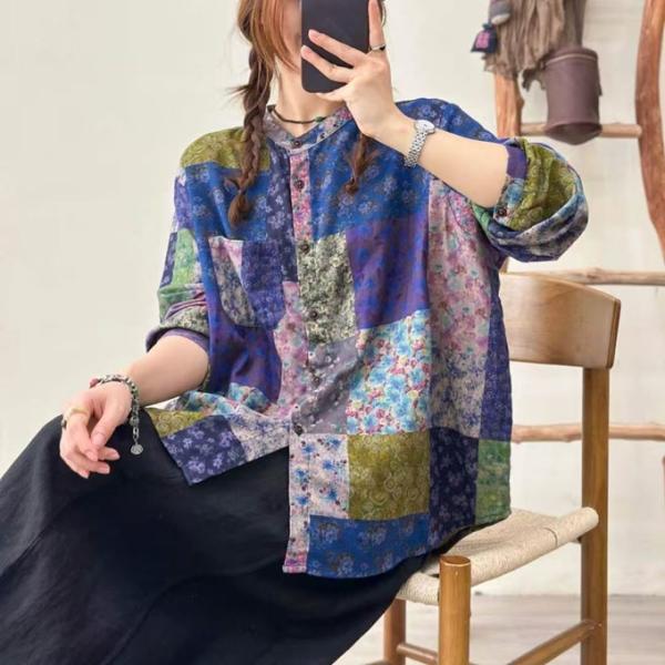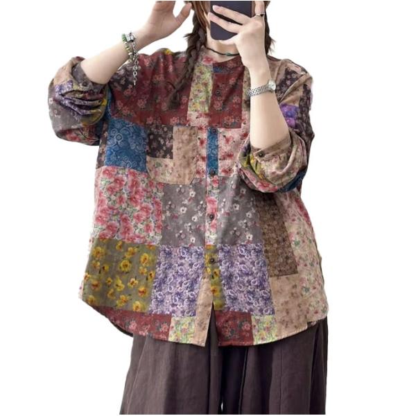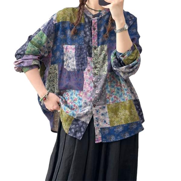 ダブルガーゼ シャツ レディース パッチワーク風 柔らかプリント デジタルプリント ゆったりサイズ 綿100% 春 夏 秋 冬 フリーサイズ 綿シャツ 着心地いい コッ