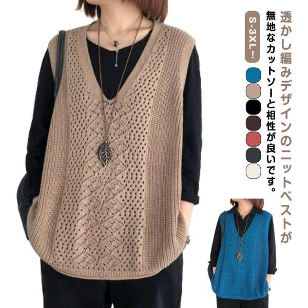 ベスト ジレ トップス レディース 夏 袖なし ニットベスト 大きいサイズ サマーベスト 秋 透かし編み 春 プルオーバー ニット トップス Vネック