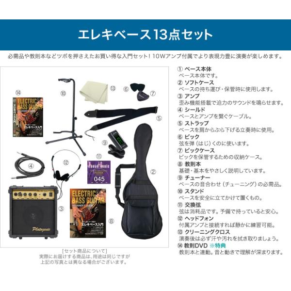 エレキベース体 / ソフトケース / アンプ(10W) / シールド / ストラップ / ピック×2枚 / ピックケース / 教則本 / 教則DVD / チューナー / ギタースタンド / 交換弦 / ヘッドフォン / クロス