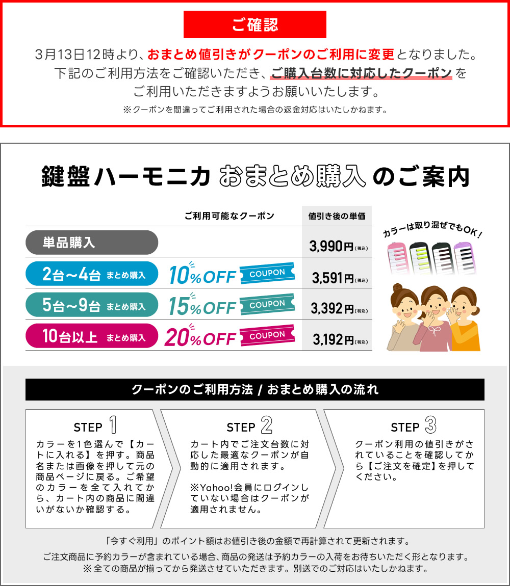【おまとめ値引きについて】カートに2台以上の鍵盤ハーモニカが入っていると、ご注文台数に対応した最適なクーポンが自動的に適用されます。※Yahoo!会員にログインしていない場合はクーポンが適用されません。