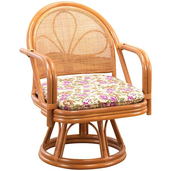 ファミリー・ライフ 天然籐肘付き回転チェア ミドルタイプ は、ゆったり座れて360度回転できる天然籐を使った回転座椅子。360度回転式で、座ったままで楽に方向変換可能。厚さ約6cmのボリュームのあるクッションで快適な座り心地。背面部分は、上部で風通しの良いカゴメ張り。立ち座りしやすい幅広のひざ掛け。和室・洋室どちらのお部屋でもお使いいただけるシンプルなデザイン。クッション部分はお部屋を明るくしてくれる花柄を採用。リラックスタイムにおすすめです!