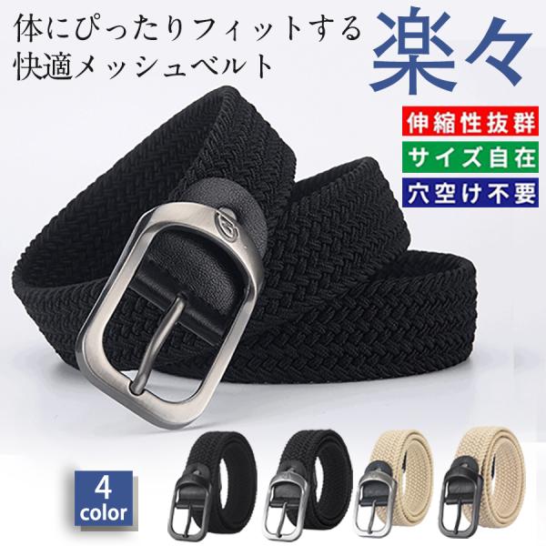 ベルト メッシュベルト 穴なし カジュアル おしゃれ ビジネス ビジカジ 学生 制服 無段階 大きいサイズ ブラック 黒 メンズ レディース ゴム バックル