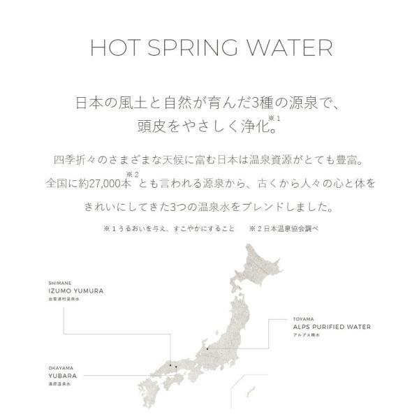 日本三カ所から採れた温泉水とボタニカルエッセンスがうるおいを与え、きらりと艶めく潤い髪へ。