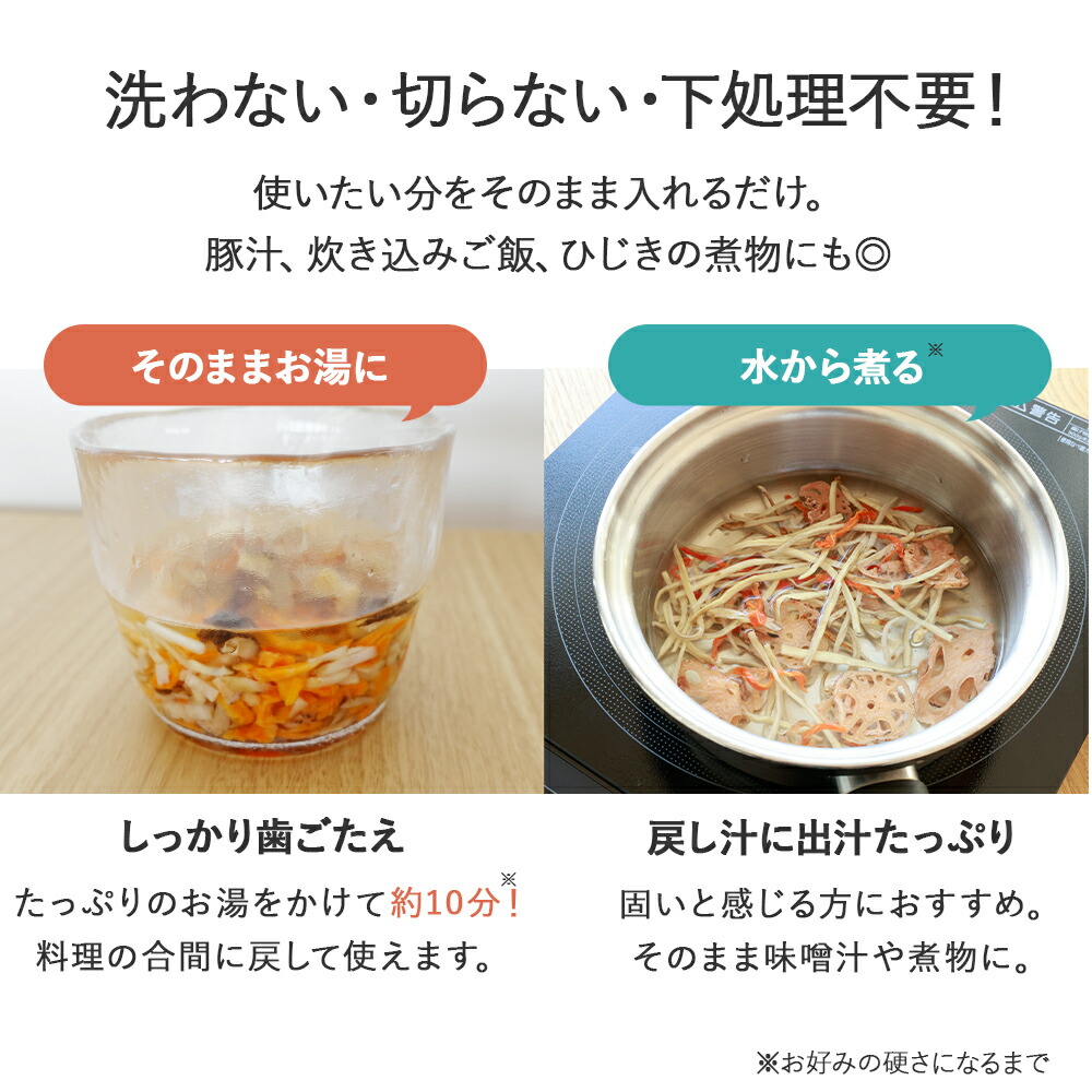 洗う・切る・下処理の手間なし。そのまま使える乾燥根菜。保存食 非常食 便利 スープ 炊き込みご飯 豚汁トッピング 野菜 ローリングストック 簡単 ドライ ごぼう しいたけ レンコン 人参