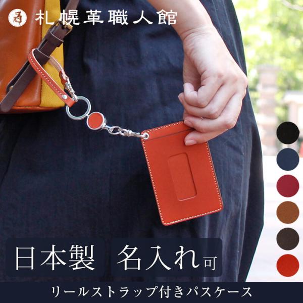 リール付きパスケース 本革 名入れ 定期入れ 札幌革職人館 ストラップ付き パスケース リールストラップ レザー メンズ レディース プレゼント 母の日