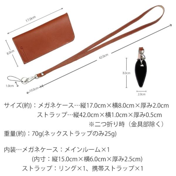 サイズ(約):メガネケース…縦17.0cm×横8.0cm×厚み2.0cm ストラップ…縦42.0cm×横1.0cm×厚み0.5cm※二つ折り時(金具部除く)