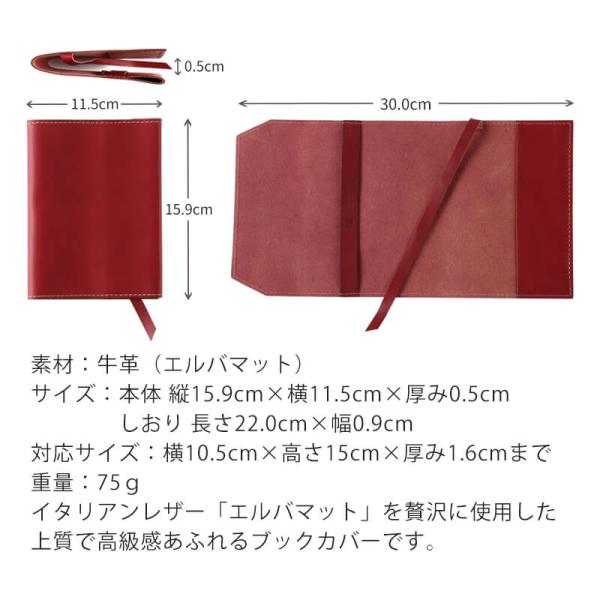 機能:革製しおり×1 (長さ22.0cm×幅0.9cm) 対応サイズ(約):横10.5cm×高さ15cm×厚み1.6cmまで可能