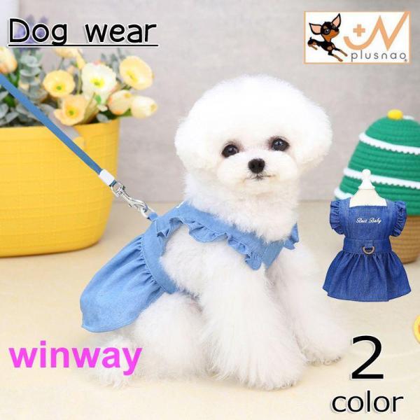 ドッグウェア ペットウェア ワンピース ペット用 犬服 小型犬 デニム Dカン付き フリル スカート リボン ボタン 袖なし お散歩 かわいい
