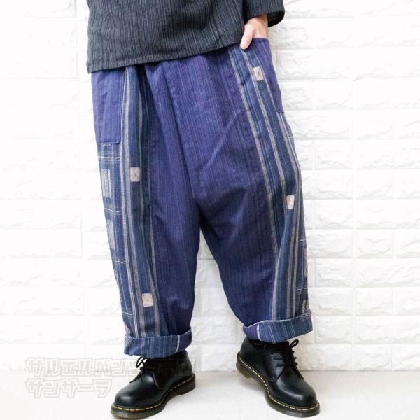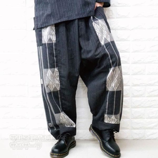 織り込み生地とエスニック模様が特徴的なサルエルパンツです。 ゆったりしたフォルムでウエストがゴムと紐になっていて、男性から女性まで幅広く使っていただけます。 ポケットは左右に1つずつ付いています。モデルは165cmの男性です。