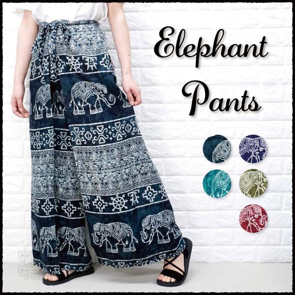 ガウチョパンツ 象柄 ワイドパンツ 巻きスカート レディース タイパンツ エスニック アジアン リゾート フリーサイズ スリット入り 春 夏 柄パンツ