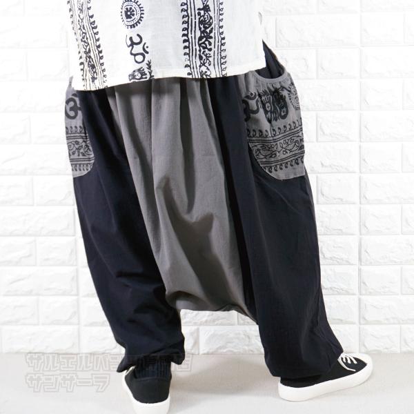 ウエストと両サイドのポケットにプリントされたエスニック柄が特徴的なワイドサルエルパンツです。