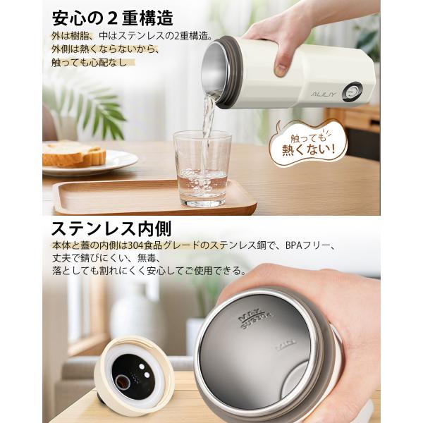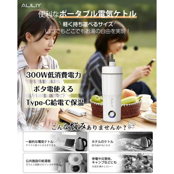 電気ケトル ポータブル トラベルケトル Type-C給電で保温 2WAY給電 小型 380ML 100V 300W消費電力 持ち運びケトル ステンレス 二重構造 湯沸かし 電気ポット