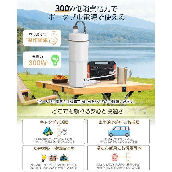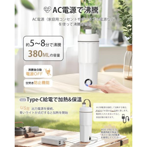 小型・軽量設計で持ち運びに便利なポータブル電気ケトル。AC+USBの2WAY給電に対応し、USB給電時は約40分で45〜70℃まで加熱・保温可能。モバイルバッテリー、PC、車載USBでも使用でき、旅行・出張・車中泊・キャンプに最適です。消費電力300Wの省電力設計で、ポータブル電源や災害時にも安心。容量380mlで約5〜8分のスピード沸騰。304食品級ステンレス製の二重構造により安全性も高く、空だき防止・自動電源OFF機能搭載。安心のアフターサポート付き。