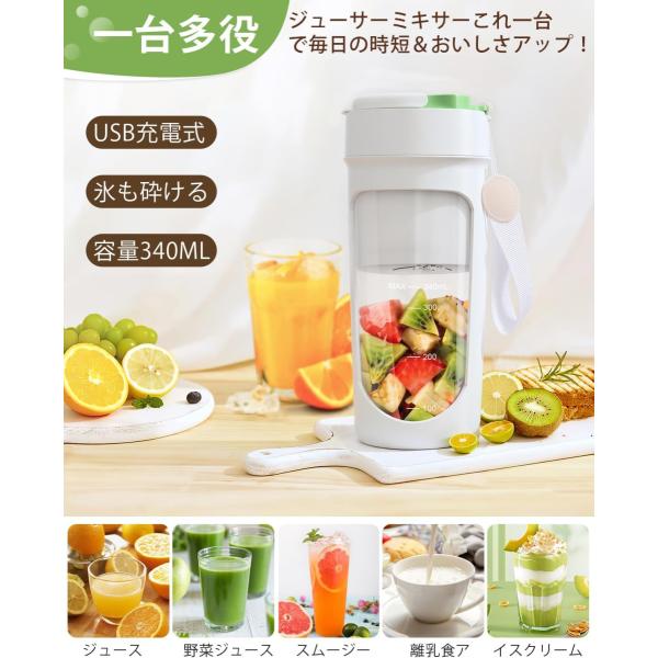 ジューサー ミキサー 小型 持ち運び コードレス スムージー 氷も砕ける 野菜 果物 離乳食用 栄養補充 一台多役 一人用 充電式 お手入れ簡単 340ml