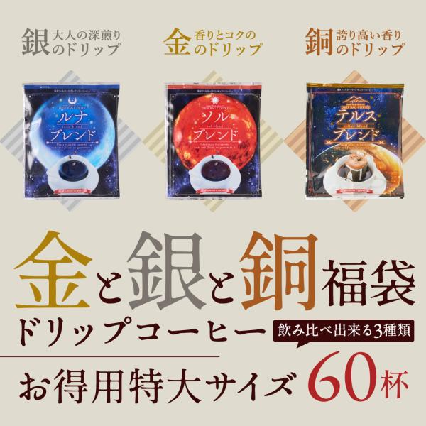 いまだけ\半額 50%OFF/ コーヒー 珈琲 ドリップ コーヒー 1分で出来る 金と銀と銅 3種 60杯分 福袋 ドリップバッグ ソルブレンド ルナブレンド 【TS】