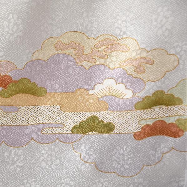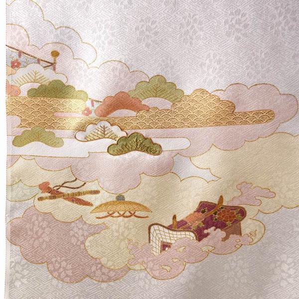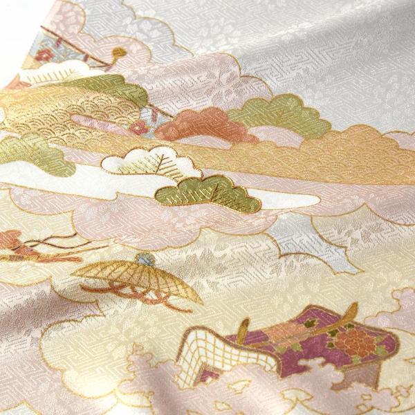 重ね雲に御所車、隠れ笠、横笛、松を描いたシンプルで上品な柄行き(一部に金駒刺繍入り)