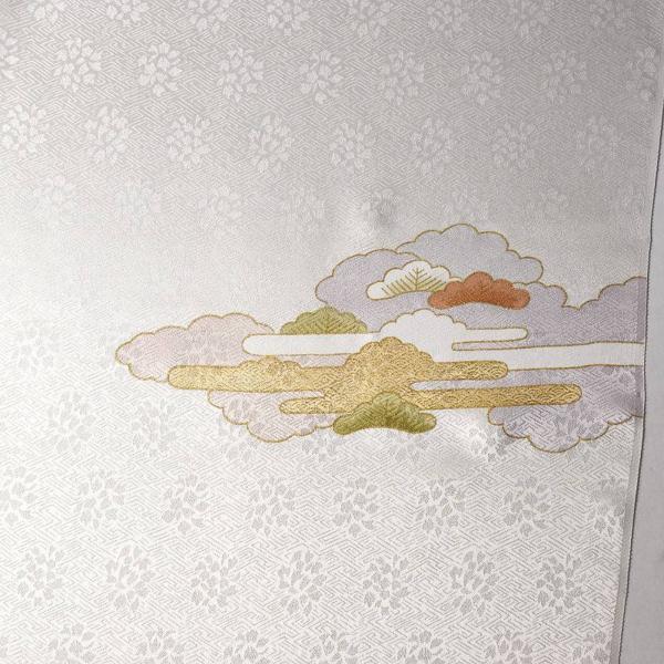 藤井寛 付下げ 手縫いお仕立て付き 皇室献上作家藤井寛氏作 雲重ね、松、御所車 オフホワイト色 身長170cm位まで、裄72.5cmまで 通年の着